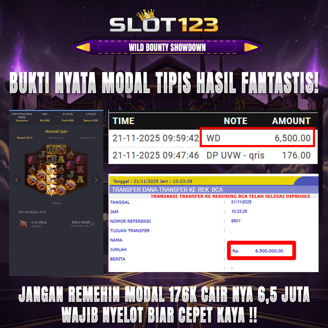 SLOT123 menghadirkan game jackpot vip yang di lengkapi fitur khusus new member hanya dengan modal deposit 176k dijamin akan withdraw 6,5 juta malam ini.